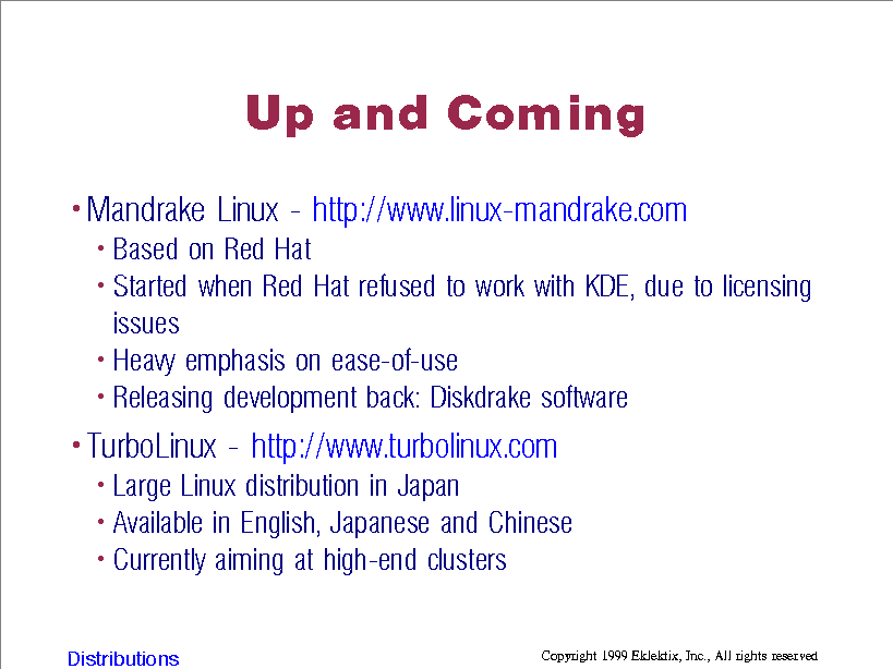 TurboLinux: high-end clustering software is internally developed and proprietary. Some controversy, their developers talked to open source developers then started proprietary projects to do the same thing.