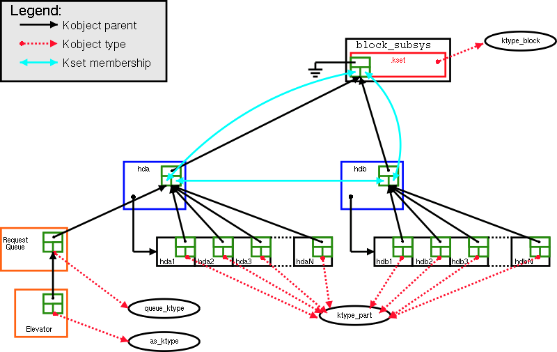 The second view, below, omits the kobject pointers in favor of the corresponding sysfs hierarchy.